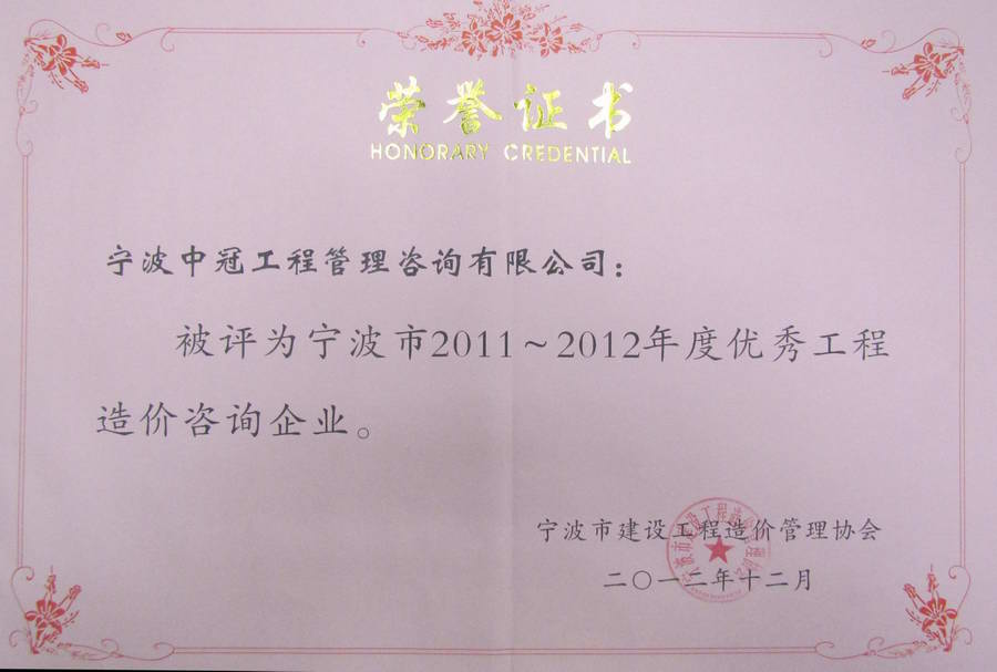 寧波市2011-2012年度優(yōu)秀工程造價咨詢企業(yè)-中冠榮譽-中冠咨詢-中冠工程管理咨詢有限公司