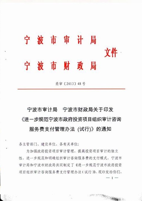 寧波市審計(jì)局、寧波市財(cái)政局文件 甬審[2013]48號(hào) 寧波市審計(jì)局 寧波市財(cái)政局關(guān)于印發(fā) 《進(jìn)一步規(guī)范寧波市政府投資項(xiàng)目組織審計(jì)咨詢服務(wù)費(fèi)支付管理辦法(試行)》的通知