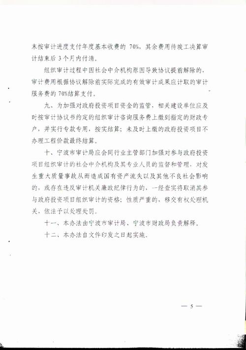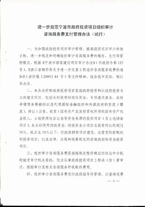 《進(jìn)一步規(guī)范寧波市政府投資項(xiàng)目組織審計(jì)咨詢服務(wù)費(fèi)支付管理辦法(試行)》的通知